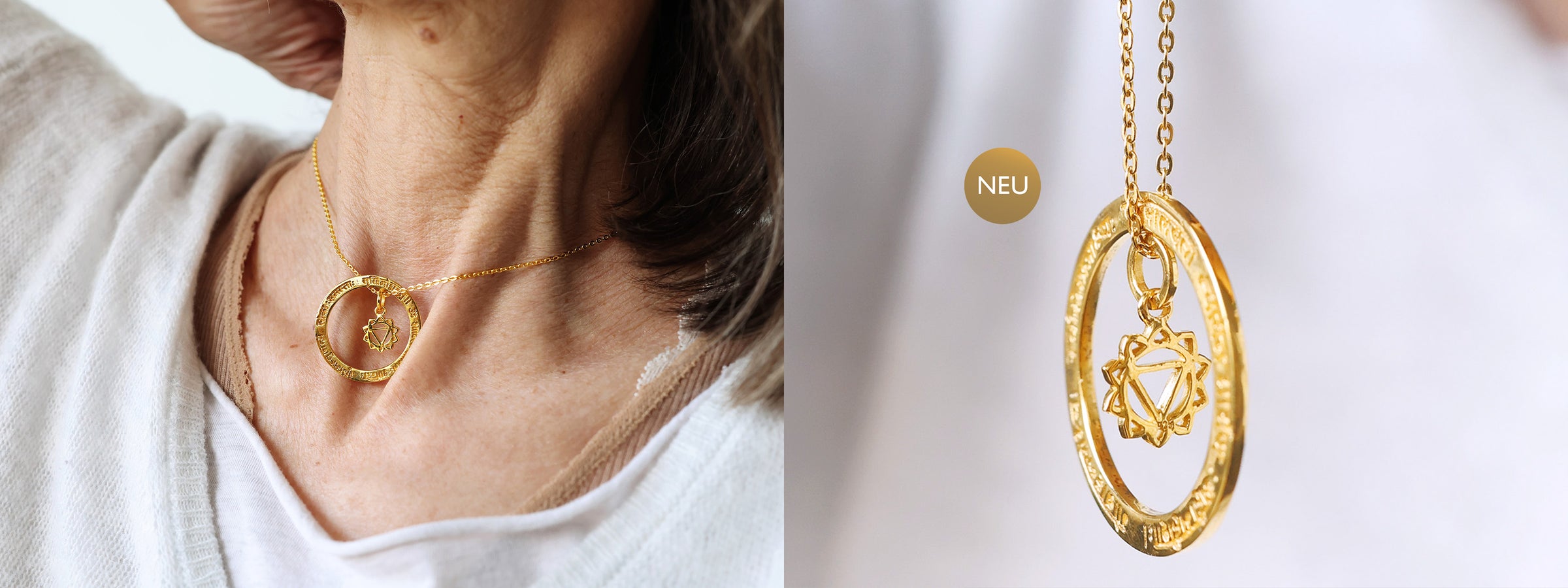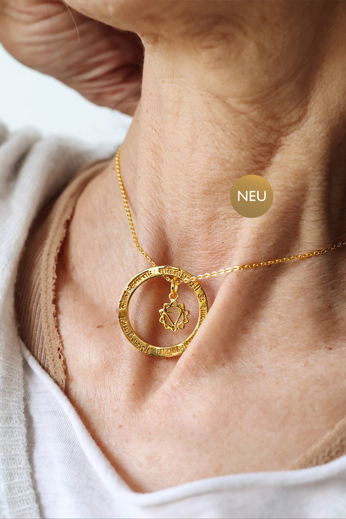 Bei dem Design unserer Mantra Anhänger haben wir uns von der Natur der Mantras, ihren göttlichen Klängen und ihren unendlichen Schwingungen inspirieren lassen. Daraus entwickelten wir für unser Design als Basisform den Kreis. Er repräsentiert die Unendlichkeit, den Kosmos, der aus Schwingungen besteht und der Kreis symbolisiert auch den Geist. Praktisch fördert er die Konzentration und hilft uns, unsere Gedanken zu fokussieren. Die kreisrunde Form und die drehende Bewegung des Anhängers, spiegelt auch das Prinzip der tibetischen Gebetsmühle wider: Jede Umdrehung entspricht einer Rezitation des Mantras.